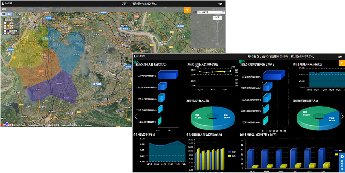 实时集中监控平台以简洁、美观的图表页面,集中展现企业各环节经营数据。武汉移动经过多年信息化的建设,已形成区域化的业务管理体系,并积累了大量的业务数据。为清晰呈现各项指标在全市范围内不同区域的整体情况,亿信BI顺利获得在GIS地图上对各区域模块进行颜色渲染,清晰展示企业业务区域的分布情况(如下图左侧所示),同时顺利获得多TAB页的展示方式(如下图右侧所示),以专题化(包括收入,用户开展、4G开展等专题)的页面,分析了各主题中不同项经营指标的排名,占比,趋势以及对比情况,从而使决策者可快速定位自己所关心的重点数据。