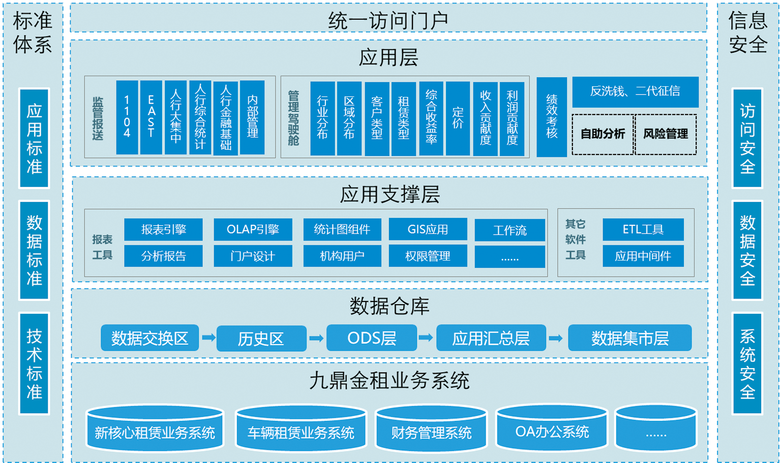 九鼎金租现在已有新核心租赁业务系统(新建)、车辆租赁业务系统、财务管理系统、OA办公管理系统等多个信息系统,各系统之间缺乏数据交互,形成信息孤岛。各系统沉淀形成的数据资产未整合挖掘充分利用。