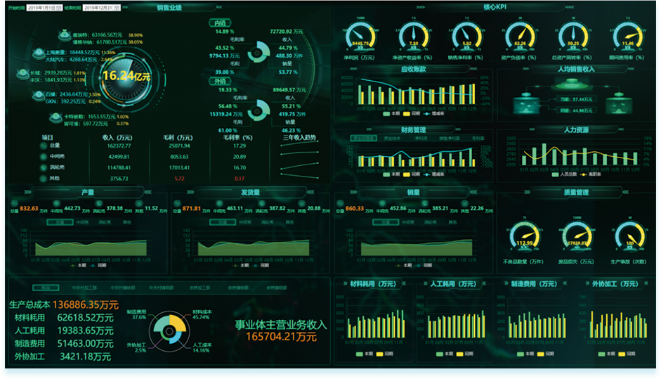 针对公司高层领导角色,从指标范围内提取核心管理指标和业绩考核数据,展现关键内容,包括核心KPI、销售业绩、产量、发货量、销售、财务管理、人力资源、生产成本等。