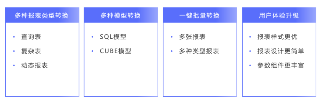 亿信ABI覆盖Cognos转换各种场景,包括各类报表(查询表、复杂表、动态报表等)、模型(SQL模型、CUBE模型、模型表等)的转换都能完美适配,给予批量转换功能,大大提高转换效率。