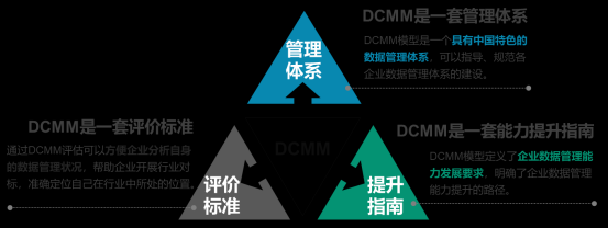 DCMM是我国首个数据管理领域正式发布的国家标准,旨在帮助企业利用先进的数据管理理念和方法,建立和评价自身数据管理能力,持续完善数据管理组织、程序和制度,充分发挥数据在促进企业向信息化、数字化、智能化开展方面的价值。
